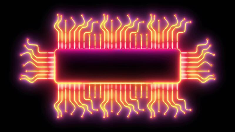 Neon Integrated Circuit Diagram Glow Animation, Futuristic Microchip Processor Outline with Multicolor Electric Traces, High-Tech PCB Electronics Visualization on Black Background Free Video