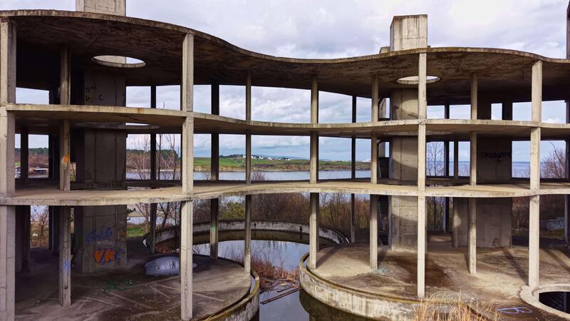 Exploring a forgotten concrete structure by the water on a cloudy day in a remote location Free Video