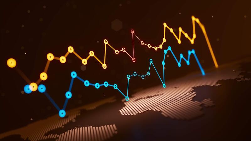 Seamless loop 3D animation of orange and blue line charts with glowing nodes over a world map, visualizing global market trends, forex rates, fintech dashboards, and data analytics. Pro Video