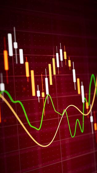 Looping 3D render of financial candles on dark red dashboard with rising and falling prices, volatility waves, and technical indicators for investment, business media, and data visuals. Pro Video
