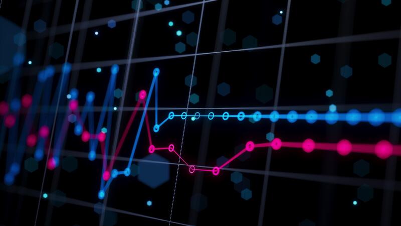 A looped 3D animation of glowing blue and pink financial line charts moving across a dark digital grid, depicting dynamic market fluctuations, stock analytics, and modern data visualization. Pro Video