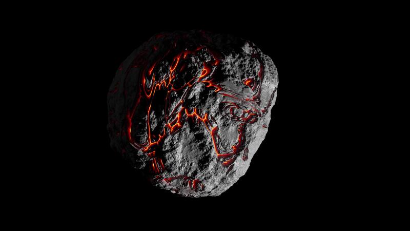 Looping animation of a space alien asteroid rotation. Fiery red lava flows across the destroyed surface of the asteroid. Cyclic slow rotation of an object in space. Alpha Channel. Pro Video