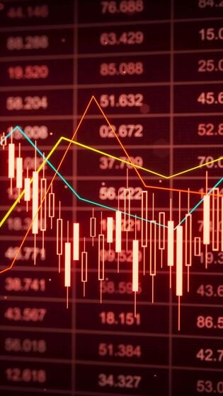 Looping render of stock price candles over a dark red data board with moving line graphs, showing volatility, technical indicators, and investment analytics for business media. Pro Video