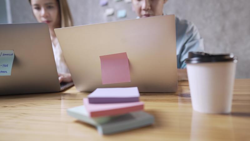 Home studio office working space, young workers get together during busy office hour, teamwork meeting solving problem, post it paper stacking, working from home during quarantine, wireless laptop Pro Video