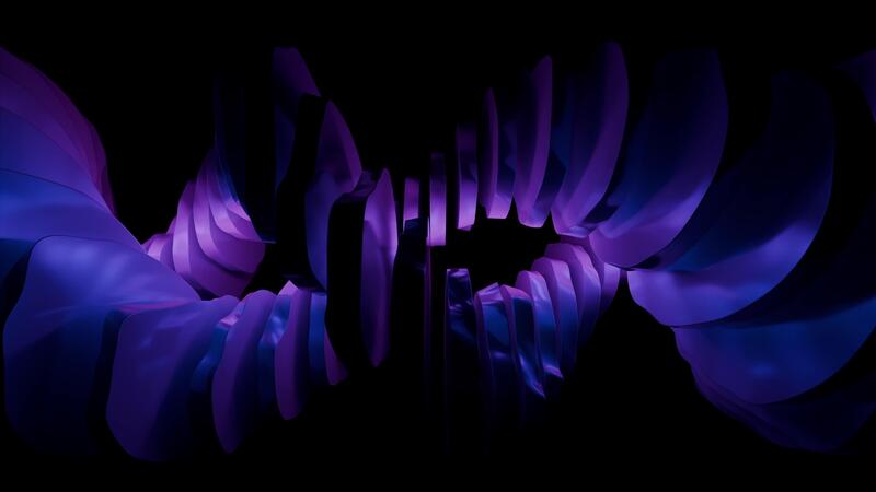 Looped 3D animation of abstract purple blue spiral structure formed by layered curved dark shapes on a black background. Twisted form with soft gradients and subtle pink highlights. Render 4K 60 fps Pro Video