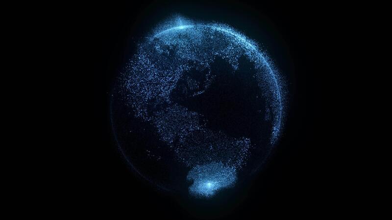 Abstract hologram of planet Earth made of blue glowing particles. Futuristic digital global network connection and data visualization loop on black background. Pro Video