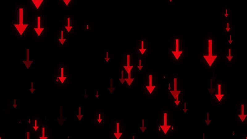 Animated glowing red arrows moving downward against a black background. A futuristic digital animation symbolizing the decline of progress, success, and financial decline. Ideal for business and tech Pro Video