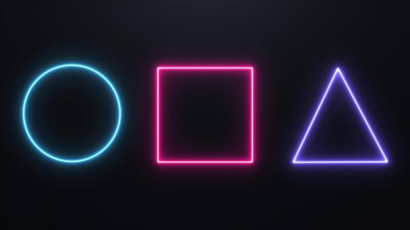 Neon glowing geometric shapes circle, square, and triangle on a dark background. Futuristic abstract design with blue, pink, and purple light. Modern minimal style for tech, UI, and digital graphics. Pro Video