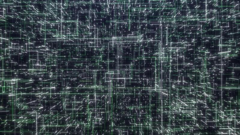 Flying through a complex, futuristic white and green glowing digital grid tunnel. Abstract high-tech matrix, data stream, and cyberpunk technology background loop. Pro Video