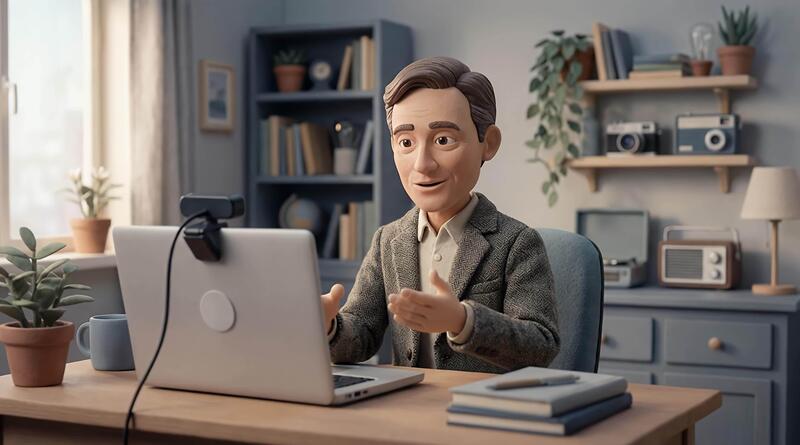 3D animated instructor teaching remote class in home office using laptop and webcam with claymation stop motion style Free Video