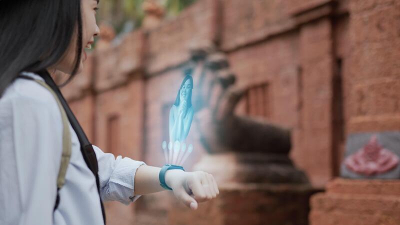 Portrait side view of Asian woman pressing buttons on smart watch while standing at ancient temple. Projecting visible AR screen and chatting on video call. Futuristic and technological concept Free Video