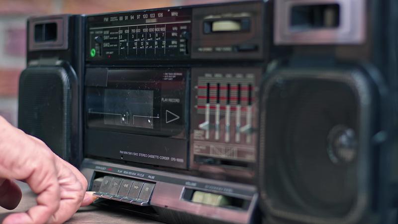 A Hand Presses the Stop Button of a Vintage Cassette Player and Ejecting the Cassette. Pro Video