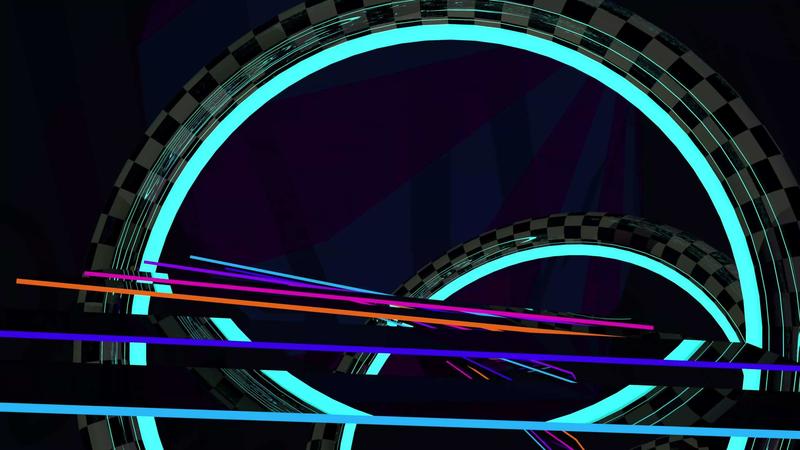 Camera travels at high speed along a futuristic roller coaster made up of luminous rings and colored rails on a dark background. Loop sequence. 3D Animation Free Video