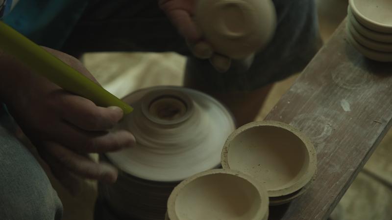 Close-up of a woman working on a potter's wheel making clay objects in pottery workshop. Female hands handle the edge of a ceramic bowl with sandpaper to reduce the sharpness before applying paint on Free Video