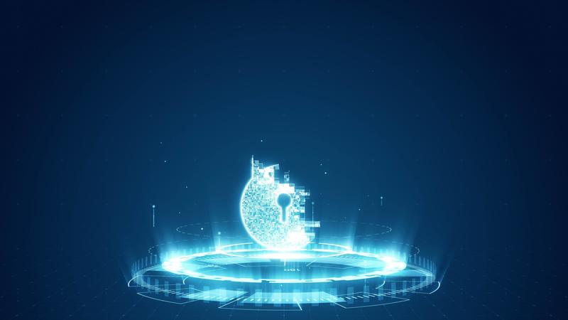 Motion graphic of Blue security key logo with digital futuristic technology circle rotation and levitation particle on abstract background Pro Video