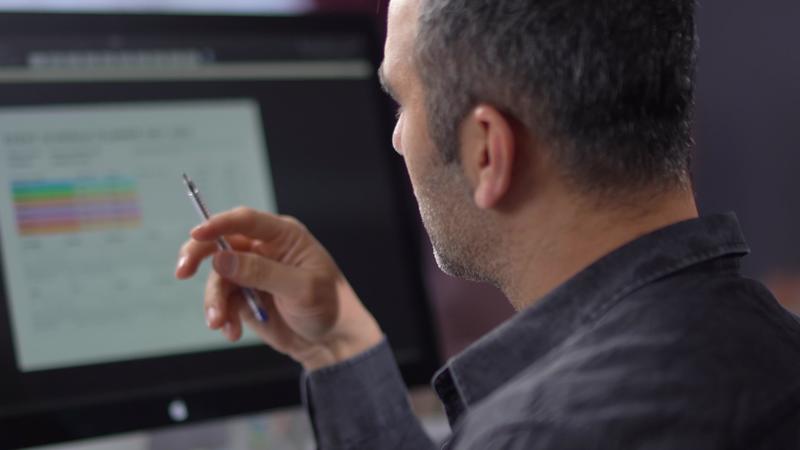 Graphical analysis on computer. Thoughtful state of employee examining graph on computer. Pro Video