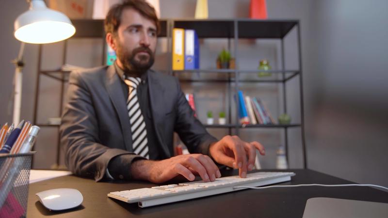 Businessman working at desk in office. Working on computer using keyboard mouse. Pro Video
