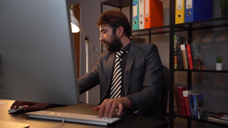 Businessman working at desk in office. Working on computer using keyboard mouse. Pro Video
