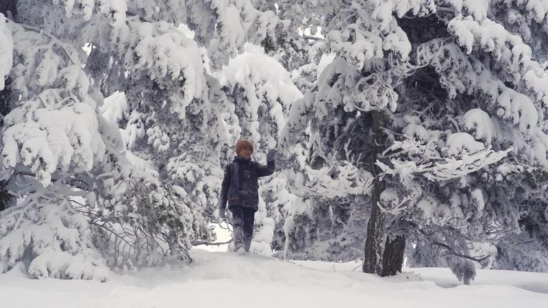 Boy touching snowy trees. The boy is walking in the forest touching the branches of snowy trees. Snow falls from tree branches as you touch it. Pro Video