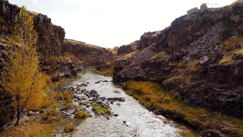 Stream flowing between cliffs in autumn. Aerial view of the stream flowing through the valley in autumn. Pro Video