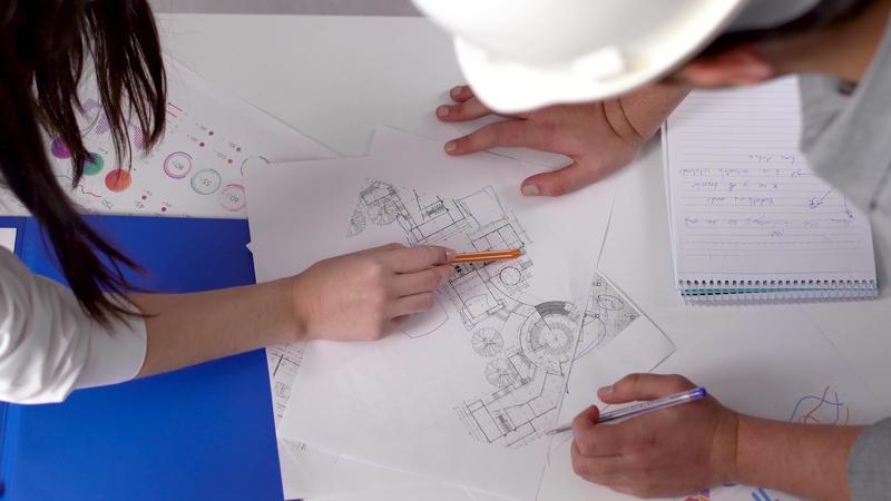 Engineers working and shaking hands. Engineers working on a project at a desk compromise and shake hands. Pro Video