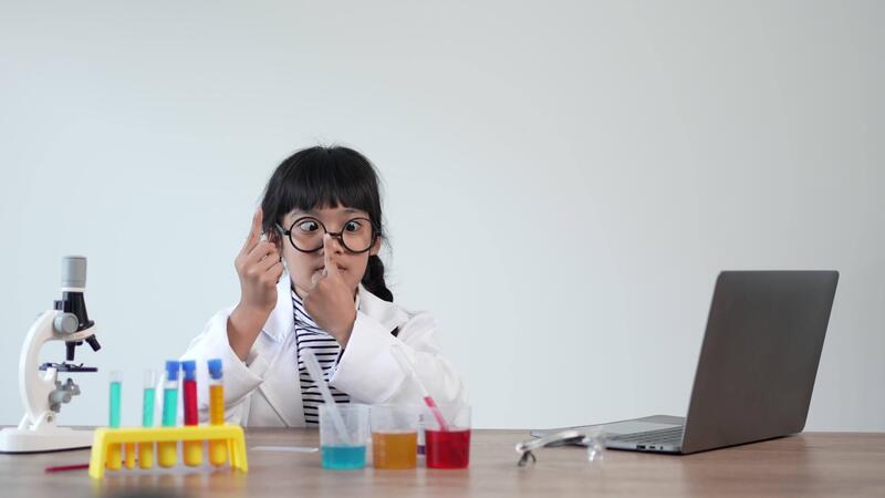 funny girl in eyeglasses laughing with happy, laptop computer and device of experimenting with liquids on table, while studying science chemistry, selective focus Free Video